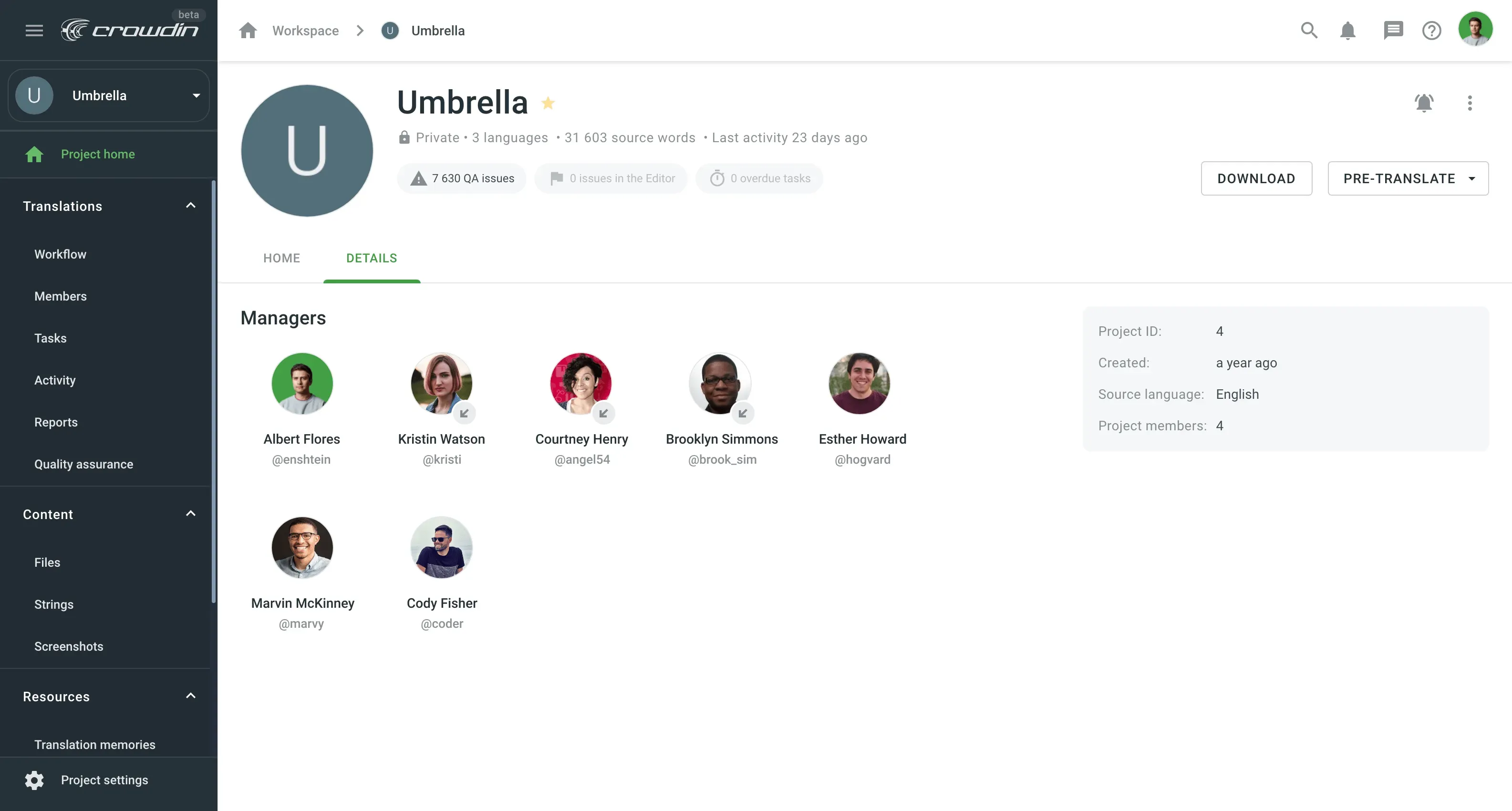 • On the project Home page, you can now right click on the target language to open the Editor or access the necessary workflow step, download translations, pre-translate content, or check activities for this language.